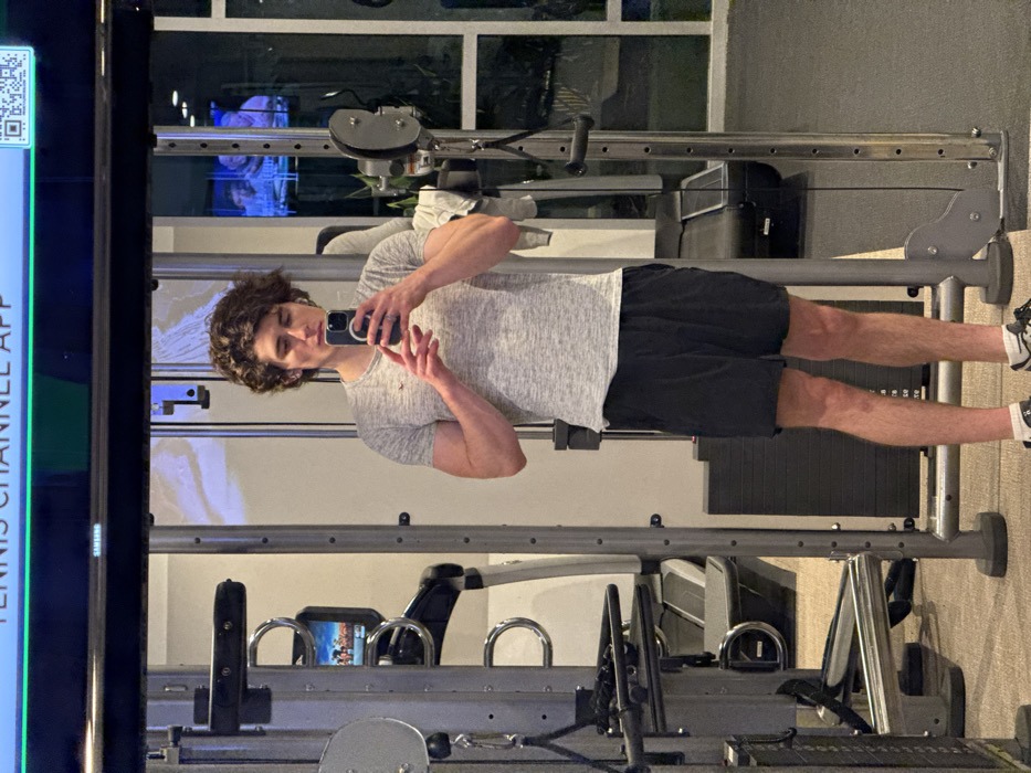 An indoor scene depicts a male subject taking a mirror selfie within a gymnasium