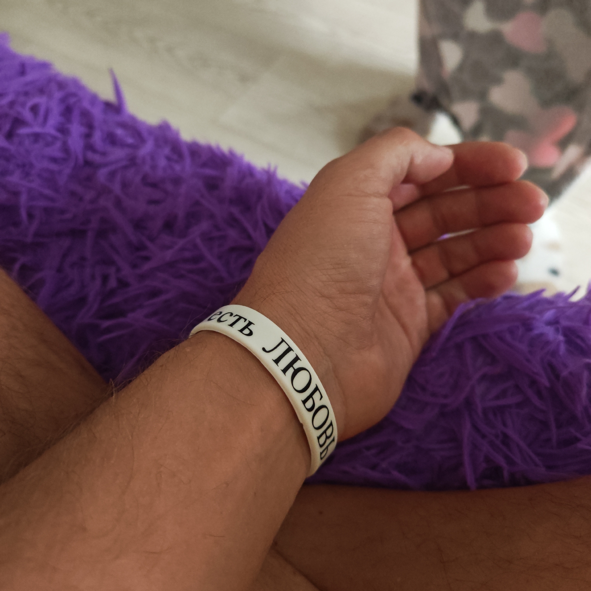 A close-up shows a person's arm resting on a purple, shag-like surface. The wrist is adorned with a white wristband featuring black lettering that reads "есть ЛЮБОВЬ" (which translates to "There is LOVE"). The background includes a surface or object with a pattern of hearts in shades of gray, white, and pink. No specific location details related to the city of Rostov, Russia are discernible.