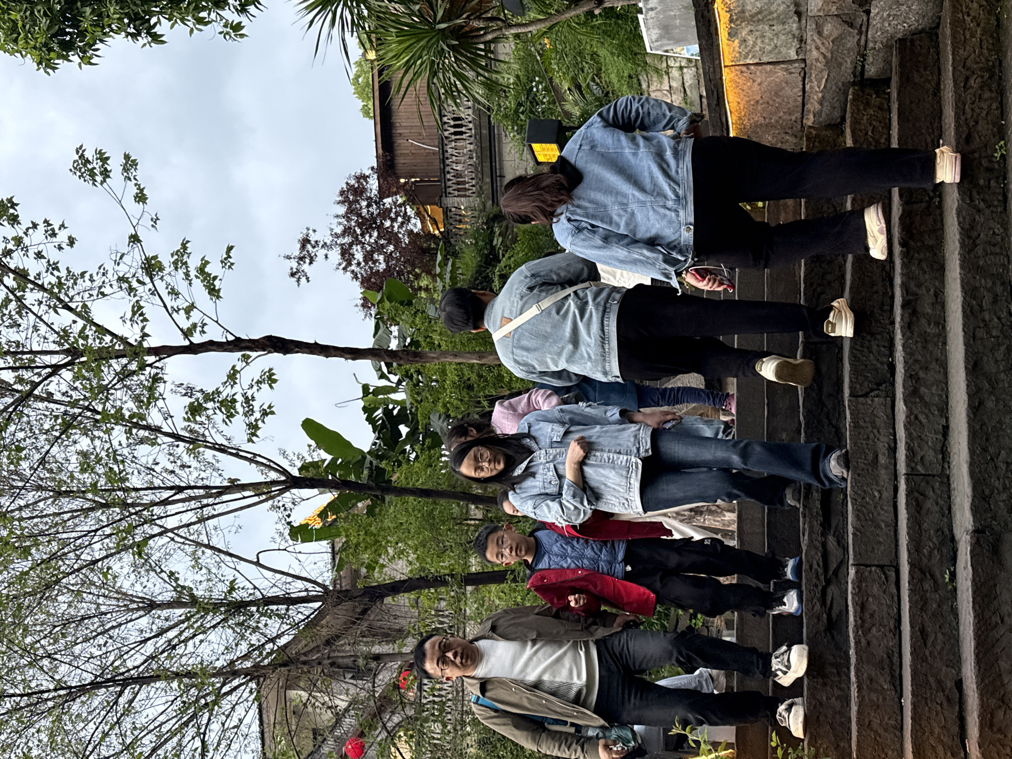 The image presents an outdoor scene in Nan'an District, China, depicting a wide stone staircase populated by several individuals. The sky is overcast and uniformly grey. In the foreground, a group of three individuals descends the rough-hewn stone steps. The leftmost is an adult male wearing glasses, an olive-green jacket over a white long-sleeved shirt, and dark pants, with a light blue strap visible across his right shoulder. Adjacent to him and slightly behind is a young boy, also wearing glasses, a red jacket over a blue garment, and dark pants. To the boy's right is an adult female with glasses, dressed in a light blue denim jacket, dark jeans, and light-colored sneakers, holding a small object in her right hand. Further up the staircase, two individuals ascend. The lead ascending figure is an adult male viewed from the back, wearing a light blue denim jacket, dark pants, and light-colored sneakers, with a white strap crossing his back. Behind him is an adult female, also viewed from the back, in a light blue denim jacket over a dark hooded garment, dark pants, and light-colored sneakers, holding a red item in her right hand. Additional indistinct figures are partially visible on the stairs in the background. The staircase is constructed from large, dark, irregular stone blocks. Green vegetation is abundant throughout the scene. On the left, tall trees with sparse green leaves are visible against the sky, partially obscuring an older building with a white balustrade, near which a red lantern hangs. On the right, dense green foliage, including broad-leafed plants resembling banana leaves and a palm-like plant, lines the stairs. A tree with dark red foliage is visible in the upper-right background, behind a wooden building with a dark roof and a decorative stone railing. Artificial warm yellow lighting strips are integrated into the stone retaining wall along the right side of the staircase.