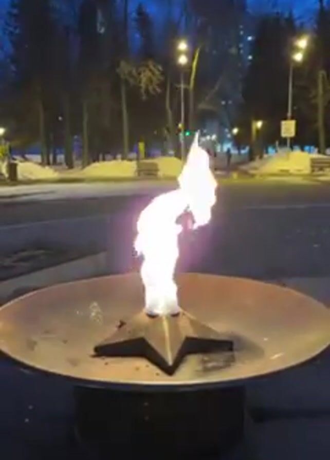 metal monument with a star design in the center and a flame burning on top. The monument is in a park-like area with snow on the ground and trees in the background. Streetlights line a street in the background. The sky is dark blue, suggesting it is evening or early morning. In the background, some people can be seen walking. The camera remains still throughout the video.