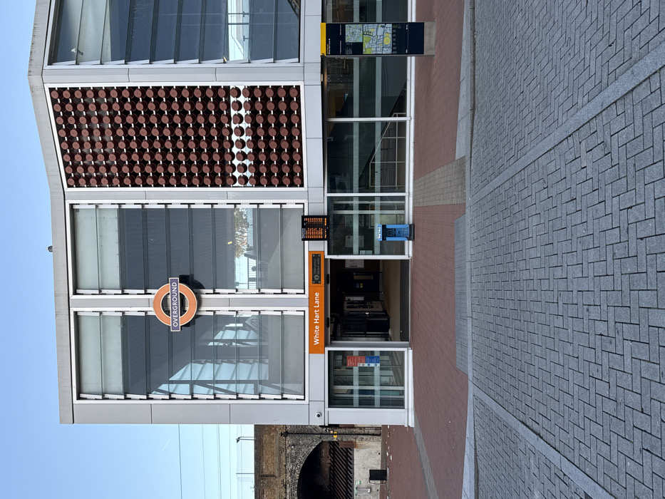 The image displays the exterior of White Hart Lane Overground station, located in London, United Kingdom