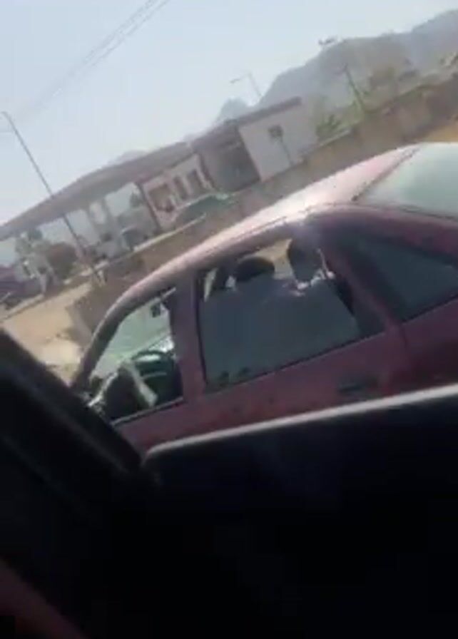 view from inside a car, driving past a gas station. People are walking in the street near the gas station. A large tanker truck is parked at the gas station. Mountains are visible in the background. The weather appears to be sunny.