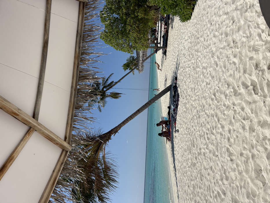 This image captures a daytime scene on a white sand beach in Thoddoo, Maldives