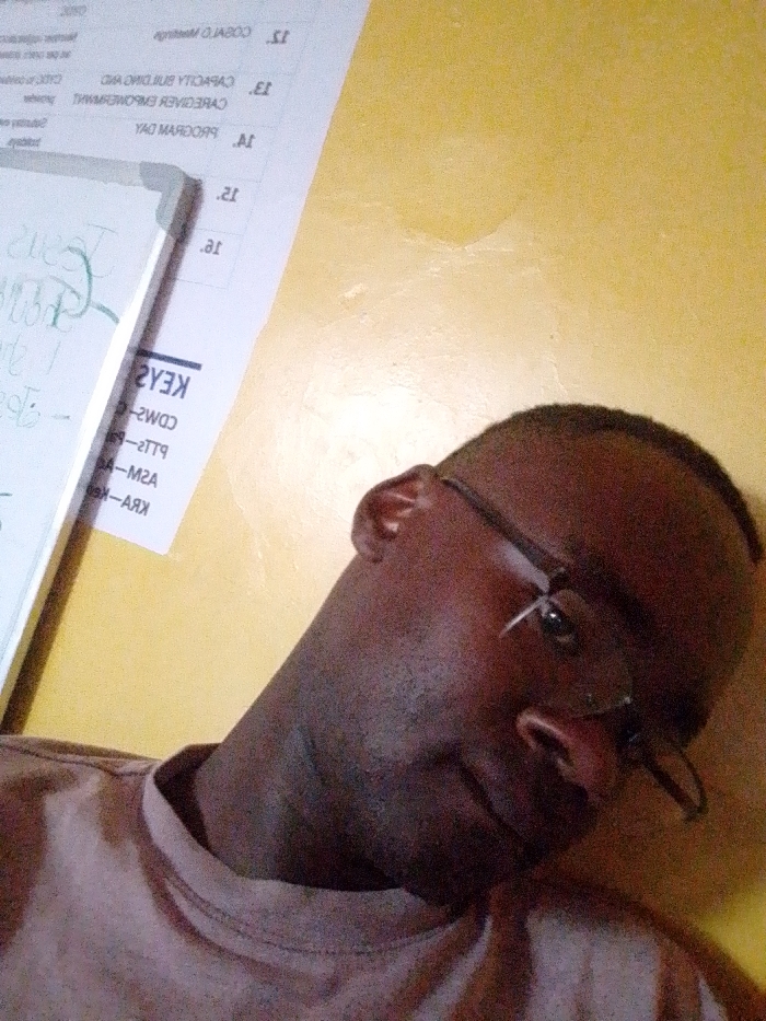 The image captures a close-up, rotated portrait of an adult male in an indoor setting in Kakamega, Kenya