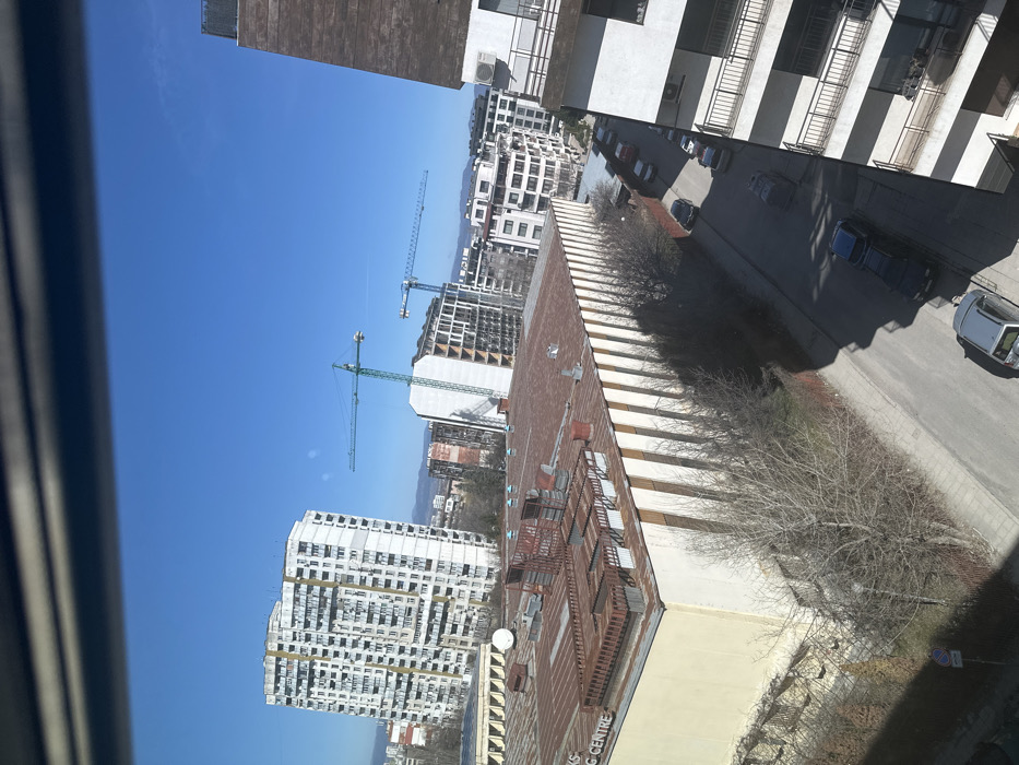 The image captures an elevated daytime view of an urban area in Sofia, Bulgaria, under a clear blue sky. The top portion of the frame is horizontally obstructed by two dark, parallel bars, likely part of a window frame or balcony railing. In the immediate foreground, a substantial, light-colored building with a large, rust-colored corrugated metal roof dominates the lower left. The roof features several industrial vents and structures. A faint, partially visible sign on the building's facade reads "SC CENTRE." Its side exhibits vertical paneling. To the right of this building, a narrow asphalt street curves, with a paved sidewalk along its edge. Sparse, bare deciduous trees and shrubs line a small embankment between the street and the building. Numerous vehicles are parked along both sides of the street, including silver, dark blue, and black passenger cars. On the far right, a modern, multi-story white residential building with dark-railed balconies is partially visible, extending from the bottom to the mid-right of the frame. Long, distinct shadows are cast by this building and the trees across the street and foreground. In the midground, a prominent, tall, white, multi-storied residential tower block, characteristic of older socialist-era architecture with numerous small, open balconies, stands on the left. This building appears weathered. Towards the center and right midground, several ongoing construction sites are visible, featuring uncompleted multi-story buildings and two large tower cranes; one green, and one blue. The background reveals a hazy horizon with distant mountains or hills under the bright, cloudless blue sky. No individuals are visible in the scene.
