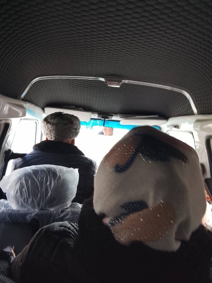 Inside a vehicle, the textured black ceiling curves overhead. A man wearing a fur hat is seated, his back to the camera. Ahead, the driver is visible in the rearview mirror. Next to the man, a person in a patterned head covering and dark coat sits with their back to the camera. The front passenger seat is covered in clear plastic. The scene is lit by daylight streaming through the windows, creating a bright exterior view.