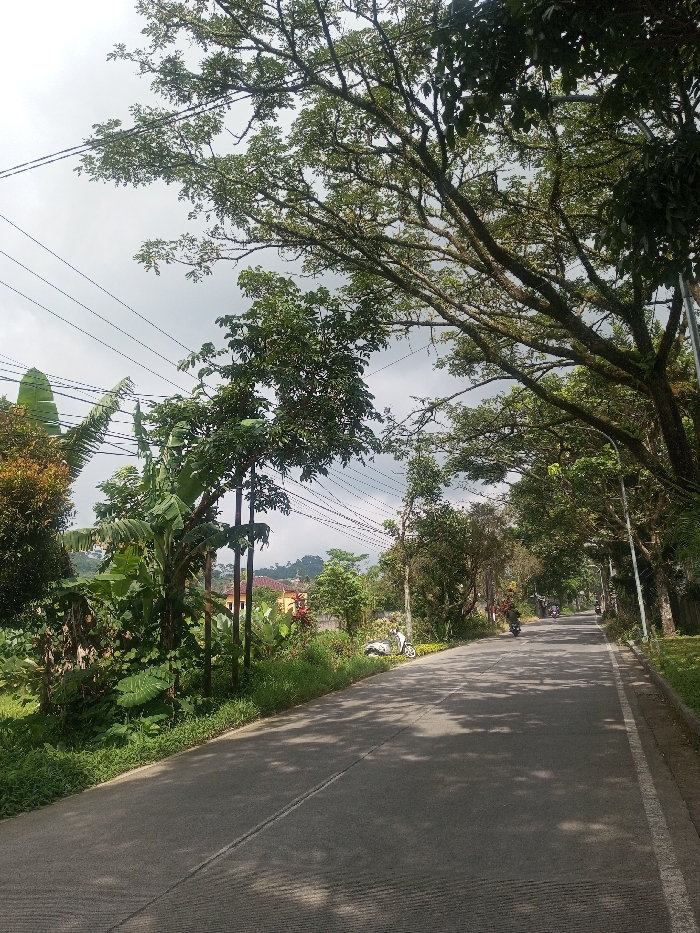 The image displays a two-lane paved road in a semi-rural environment within the city of Unknown, Vietnam, under an overcast sky with patches of sunlight casting dappled shadows. The road surface exhibits a textured pattern, and a solid white line marks the right shoulder. Mature trees with extensive green canopies, some bearing moss or epiphytes, line the right side of the road, and a street light pole is visible further down. The left side of the road is bordered by dense tropical vegetation, including prominent banana plants, with power lines suspended overhead. In the mid-ground, a cream-colored building with a red roof is partially visible behind the foliage, and distant hills or mountains rise in the background. A white scooter is parked off the left side of the road, partially obscured by undergrowth. Two individuals are observed operating motorcycles or scooters, driving away from the viewer on the road.
