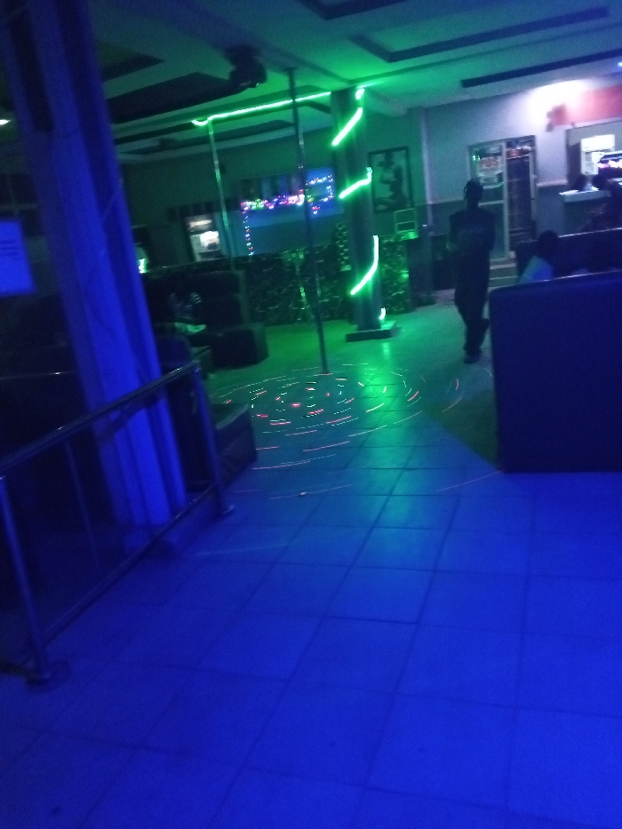 The interior of a dimly lit establishment features blue and green lighting. A pole stands centrally, encircled by radial light patterns on the floor. Bar seating and a person walking are visible in the background. A metal railing and a blue upholstered structure stand in the foreground. The room's lighting and layout suggest a bar or entertainment venue.
