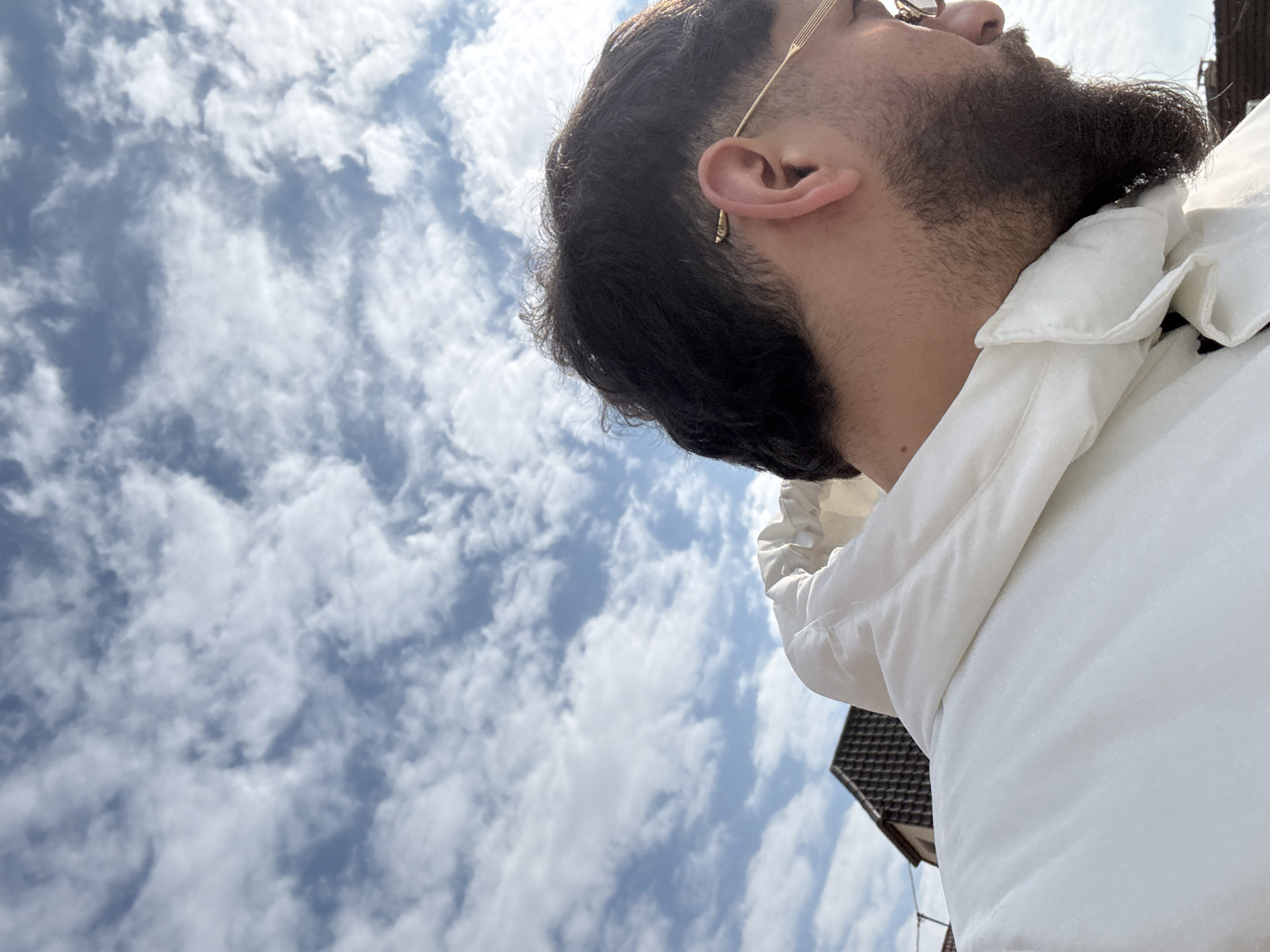 The image depicts a close-up, profile view of an adult male in Lingolsheim, France, facing towards the right side of the frame. The subject has dark, medium-length hair with faded sides and a full, dark beard. He is wearing a white hooded garment, possibly a jacket or sweatshirt, with the hood visible around his neck. Gold-colored eyeglasses with thin frames are present on his right ear, and a gold-colored earphone is partially visible in his right ear canal. The background consists primarily of a blue sky with scattered white cumulus clouds. A portion of a residential building, featuring a dark brown tiled roof and a light-colored wall, is visible in the lower left background, suggesting an outdoor, possibly elevated, vantage point.