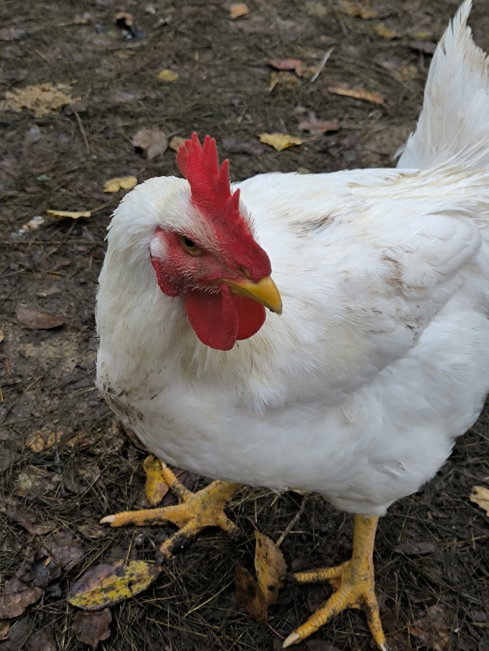 - "A white domestic fowl, specifically a chicken or rooster, is captured in a close-up, high-angle shot, standing on dark, damp earth mixed with scattered brown and yellowish-brown fallen leaves and organic debris in Parkhomivka, Ukraine" by FM-dWhzM2, licensed under CC BY 4.0