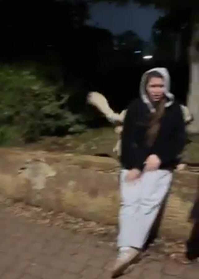 three women sitting on a short wall outside at night. To the left, a young woman in a hooded sweatshirt pets a large, white dog. The woman in the middle is wearing a black hooded robe. The woman on the right has long curly hair and is wearing a dark coat. The area is dimly lit, with some light visible in the distance. The background includes trees and some buildings. The dog jumps up onto the wall with the women.