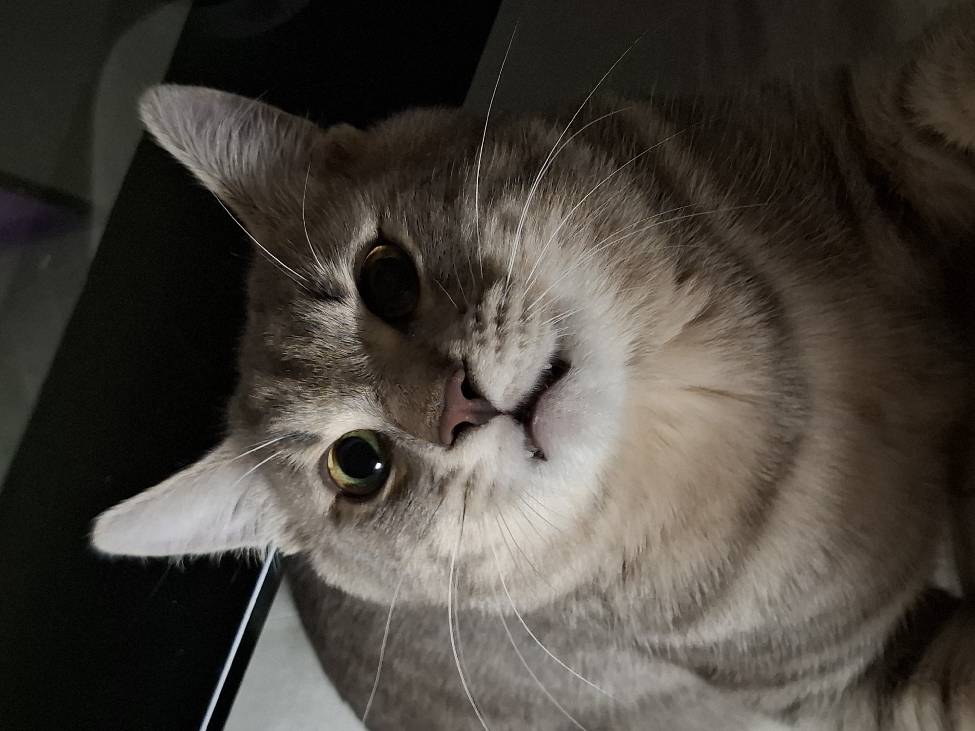 A close-up photograph captures a gray tabby cat with wide, inquisitive eyes of amber and green. The cat's face is tilted, revealing a pink nose, white whiskers, and a partially visible pink tongue. The fur is a mix of gray and beige tones. A dark, solid-colored surface is visible in the lower left corner of the frame. It cannot be determined if the location is in Novi Sad, Serbia.