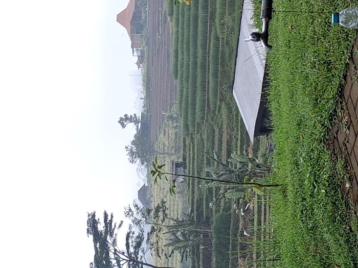 Lush green rice terraces cascade down a hillside under a hazy sky. A small building with a gray roof sits amid the vegetation. A water tap and a discarded bottle rest atop a patch of grass near a brick-paved walkway. Trees and smaller plants add to the dense greenery. In the distance, a traditional structure with a reddish roof is visible. The scene evokes a sense of tranquility and rural beauty.