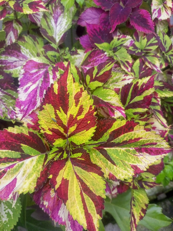 The scene in Zee Pin Kone, Myanmar, presents a close-up, top-down view of dense, variegated plant foliage. The image is filled entirely with overlapping leaves exhibiting intricate patterns of color. Dominant colors include shades of deep red, bright yellow, lime green, and vibrant magenta or purple, often appearing in irregular stripes, splotches, or mottling across the leaf surfaces. The leaves are generally ovate with serrated edges and pointed tips. On a prominent central leaf, which displays bold red and yellow striping with green margins, a single, slender, pale blue-green insect, approximately 5-7mm in length, is observed resting longitudinally along one of the yellow veins. The overall environment is characterized by the lush, natural growth of these plants under even, ambient lighting conditions, with no discernible artificial structures or human presence.