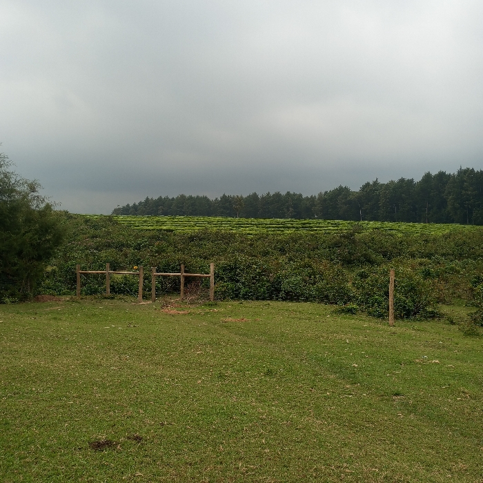 The scene depicts an agricultural landscape in Mahiakalo ward, Kenya, under an overcast sky. In the foreground, a verdant grassy area covers the lower third of the frame, showing some patches of exposed soil. Centered within this grassy area are three unpainted wooden posts, forming a rudimentary gate-like structure, with two posts defining an opening and a third standing solitary to the right. Immediately behind this structure and the grass is a dense band of varied green foliage, possibly wild shrubs or unkempt bushes. Beyond this, a large, well-maintained tea plantation extends across the midground, characterized by rows of uniformly pruned green tea bushes that follow the gentle contours of the land. In the distant background, a dense line of dark green trees forms a natural boundary, rising against a grey, cloudy sky that dominates the upper half of the image. No individuals, animals, or explicit actions are visible within the frame.