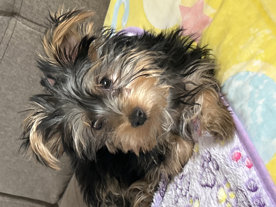 A small Yorkshire Terrier or similar breed dog is depicted in a medium-level, frontal shot, resting indoors