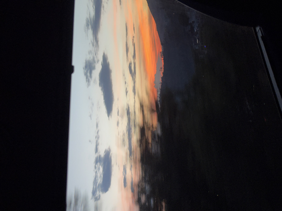 A photograph displays a sunset sky filled with clouds, transitioning from soft blues and grays to vibrant oranges. The sky meets a dark, indistinguishable mass on the right side, possibly representing land or trees. The picture is taken at an angle, suggesting it is an image of a screen or a framed print. The surrounding area is predominantly black, emphasizing the luminosity of the sunset.