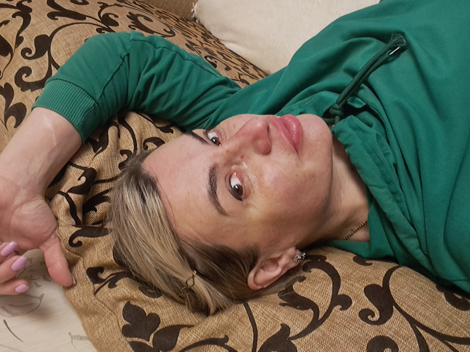 A fair-skinned woman with blonde and brown hair, wearing a green hooded sweatshirt, is lying on a patterned brown and beige surface. Her head is tilted back, and she is looking directly at the camera with brown eyes. Her right arm is extended above her head, with her hand partially visible in the lower-left corner, displaying pink nail polish. A small earring is visible on her left ear. A thin gold chain is around her neck. The location is unknown, and there is no indication of the city of Elektrostal, Russia.