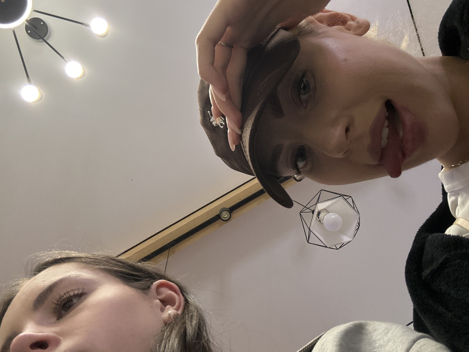 From a low angle, two young women are seen. One wears a brown cap and playfully sticks out her tongue. Her companion, positioned lower in the frame, displays a partial view of her face, specifically her eye, nose, and ear. Above them, a modern chandelier-style light fixture is visible, along with a beam of light. The background is mostly a plain white ceiling.