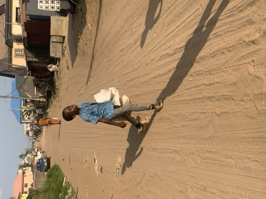 A young boy in a blue shirt, gray pants, and sandals walks along a sandy, unpaved road. He carries a large white bag on his shoulder. Tall buildings line one side of the street, while lower houses and vegetation are visible on the other. The sun is shining, casting a long shadow of the boy along the ground. Other people are walking down the street in the distance.
