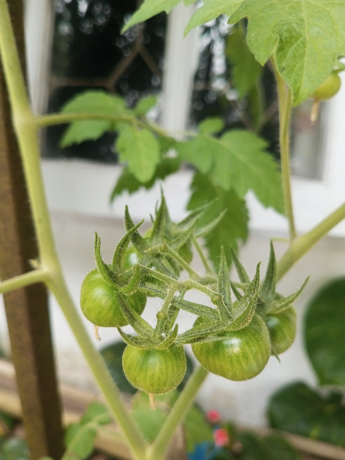 A close-up showcases a cluster of green, unripe tomatoes on a thriving tomato plant. The tomatoes are round with stripes, and are surrounded by spiky green sepals. Lush green leaves fill the background, some in sharp focus, others softened by depth of field. A blurred window adds a backdrop, while part of a brown wooden stake is visible on the left. Hints of pink flowers appear at the bottom of the frame.