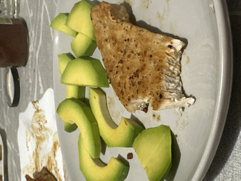 The image displays a close-up of a meal served on a light-colored, round ceramic plate, located in Rostov-on-Don, Russia. The plate contains a substantial piece of cooked, seasoned protein, likely poultry, characterized by a light brown exterior with dark seasoning specks. A portion of the protein has been consumed or cut, revealing a white, fibrous interior. Arranged around this protein are multiple slices of avocado, exhibiting vibrant green skin edges and pale green to yellow-green flesh, some appearing crescent-shaped, others as wedges. Small brown food specks are present on the plate surface. In the blurred background, a grey patterned tablecloth or placemat is visible. To the upper left, a soiled white rectangular plate or dish with brown residue is partially visible. To the upper right, a clear glass bottle containing a dark liquid and a black screw-top lid, along with a separate black jar lid, are discernible. No individuals are present in the frame. The scene suggests an indoor dining environment.