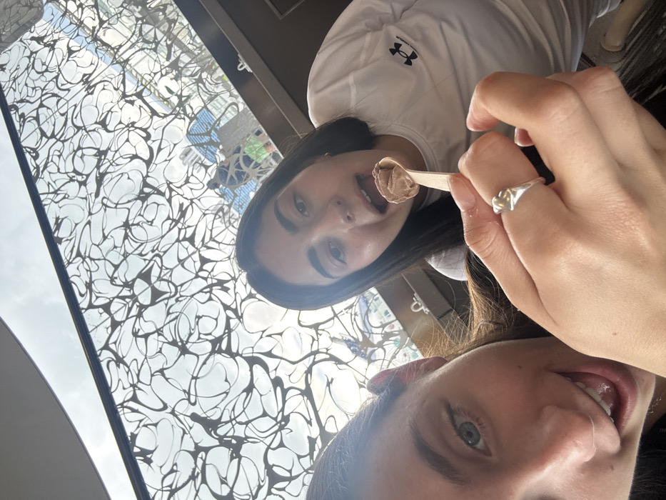 The image captures two young adult females indoors at a location in the Berry Islands, Bahamas. In the foreground, partially visible on the left, is a female with blue eyes and a smile. Her right hand, featuring a silver knot-design ring, holds a wooden spoon with a scoop of chocolate-colored ice cream. This spoon is extended towards a second female, positioned centrally, who has dark hair and dark eyes. She wears a white long-sleeved shirt with a black Under Armour logo on the left chest and is shown with her mouth open, leaning forward to consume the ice cream. Overhead, a distinctive glass ceiling with an intricate, dark, organic-patterned metal overlay is visible. This ceiling reflects a bright sky with clouds and a blurred figure of an individual in the distance, suggesting an open-air or atrium-like environment under daylight conditions.