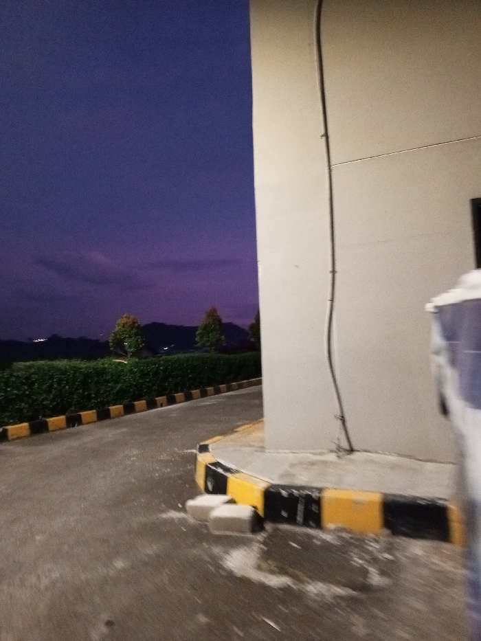 A street scene is captured at dusk. A pale wall with a black cable running down it stands prominently. A road curves to the left, bordered by a green hedge and a yellow-and-black curb. A water cooler is partially visible in the lower right corner. The sky is a deep purple hue with hints of orange near the horizon, and distant hills are silhouetted in the background. Two small trees punctuate the hedge line. The lighting suggests it is close to nightfall.