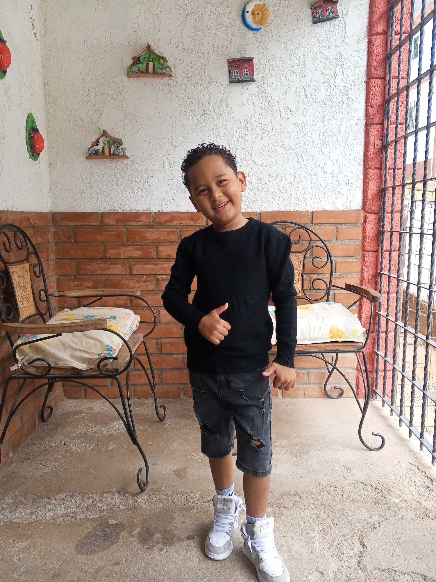 A young boy stands on a patio, smiling and giving a thumbs-up. He is wearing a black sweater, dark gray shorts, gray and white sneakers, and gray socks. He has short, curly dark hair. Behind him are two wrought-iron chairs with cushions. The patio floor is concrete. The back wall is partially white with small decorative objects attached, and partially brick. A red painted brick pillar and metal bars are on the right side. The image appears to be taken on a porch in Las Tejerías, Venezuela.