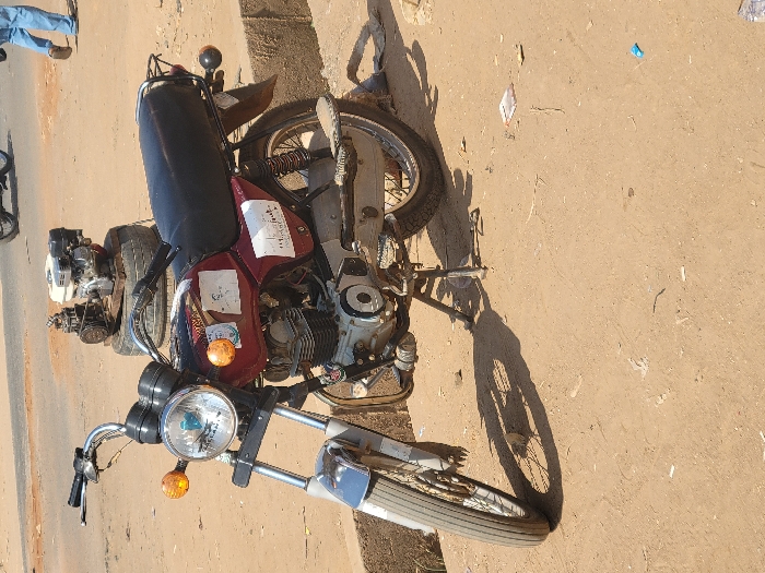 The scene depicts an outdoor urban environment in Suleja, Nigeria, under bright sunlight that casts distinct shadows. In the immediate foreground and midground, a maroon-colored commuter motorcycle is parked on a dry, light brown dirt shoulder, resting on its kickstand. The motorcycle features a chrome-bezelled round headlight, amber turn signals, chrome handlebars, a black seat, and an exposed engine with a silver-toned exhaust pipe. Faded decals, including a black-and-white portrait-like image, are visible on the fuel tank, and a white sticker is on the side panel. The ground beneath the motorcycle is unpaved and contains scattered small debris, including white plastic fragments and a blue wrapper. Immediately behind the motorcycle, on the same dirt shoulder, two black vehicle tires are stacked. Placed on top of these tires are two small, beige and black gasoline-powered engines, possibly generators or water pumps, each with a visible fuel tank and pull-start mechanism. In the background, a paved road extends horizontally across the frame, separated from the dirt shoulder by a low concrete curb. A person wearing light blue attire and dark shoes is walking away from the camera on the right side of the paved road. A portion of a wheel, possibly from another motorcycle or bicycle, is visible further left on the road.