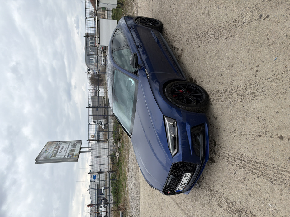 A dark blue Audi A5 Sportback is parked on an uneven, textured concrete surface displaying tire tracks and minor debris. The vehicle is presented in a front-left three-quarter view, featuring a black honeycomb grille, LED headlights, black multi-spoke alloy wheels, and visible red brake calipers. A Bulgarian license plate, "CB 9212 XK", is affixed to the front bumper. In the mid-ground, a black modular mesh fence with vertical posts extends horizontally, separating the immediate parking area from the background. Sparse, dry vegetation is visible at the base of this fence. The background, set in Kostinbrod, Bulgaria, features several industrial-style buildings behind the fence. A prominent, tall billboard supported by twin poles stands to the left of the frame's center. This billboard displays images and Bulgarian text, notably "75 ГОДИНИ" (75 Years) and "ИНСТИТУТ ПО МЕХАНОТЕХНИКА И ЕЛЕКТРОТЕХНИКА" (Institute of Mechanical Engineering and Electrical Engineering). Other vehicles, including a white van and a white truck, are partially visible beyond the fence and buildings. The sky is overcast with a uniform grey cloud cover. No individuals are present in the scene.