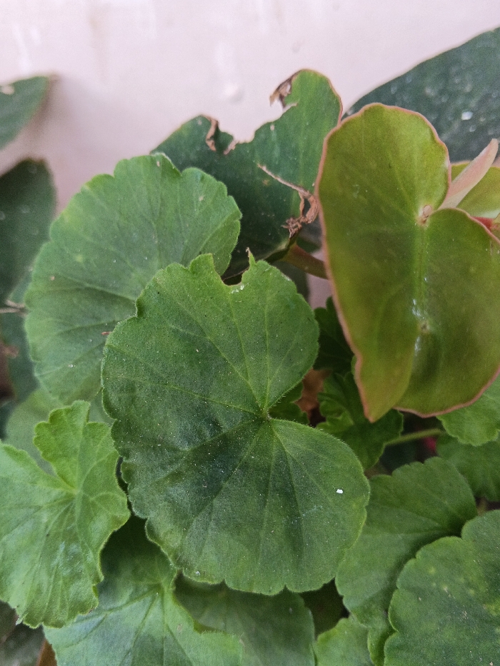 Close-up of green plant leaves with rounded shapes and visible veins. Some leaves have jagged edges, and others have a smooth, distinct outline. The leaves exhibit varying shades of green, with hints of reddish-pink around the edges of one leaf. Tiny white specks are scattered on some leaves. The background appears to be a plain, light color, contrasting with the vivid green foliage.