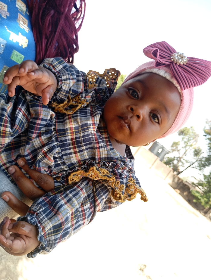 - "A dark-skinned infant, clad in a blue, red, and white plaid long-sleeved top with yellow lace trim, and a pink knitted headband adorned with a large pleated pink bow featuring a central pearl-studded embellishment, is held by an adult" by FM-mPBTm2, licensed under CC BY 4.0