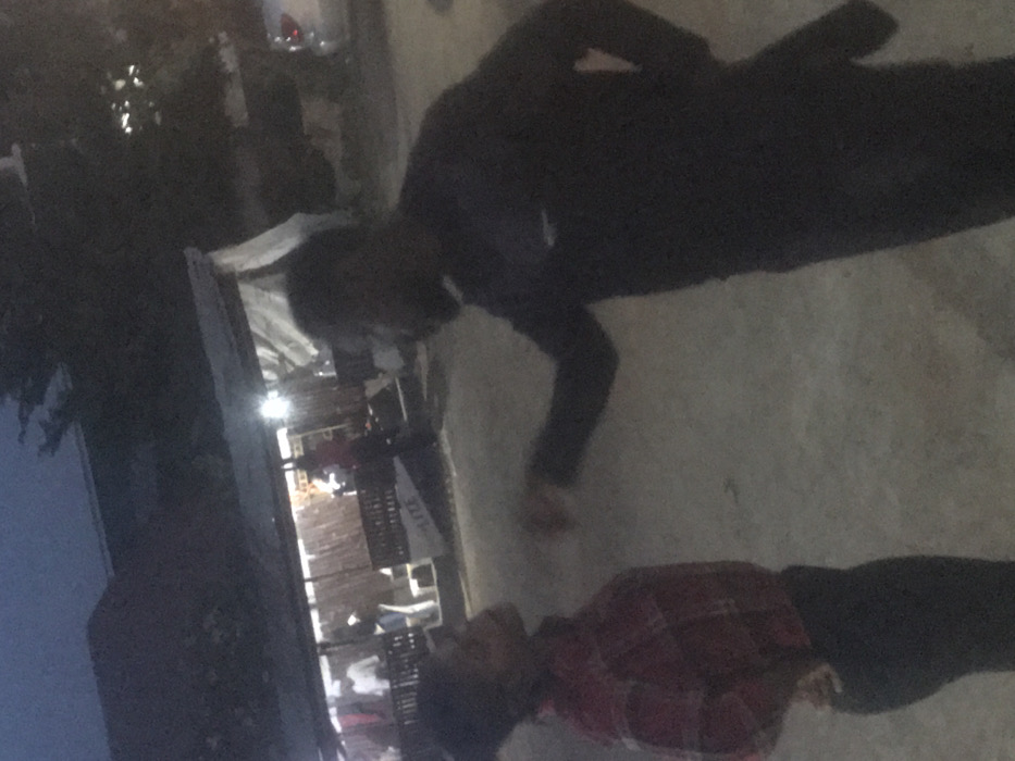 Two men are positioned outside a building at dusk. One man, dressed in black, stands above the other man, who is wearing a red and black checkered shirt and black pants. The building behind them is dimly lit, with visible interior details and signage. The setting suggests a late evening or night scene.