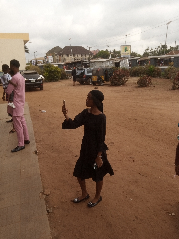 The scene unfolds in an open, public area within Nsugbe, Nigeria, under an overcast sky. In the foreground, a young woman stands on reddish-brown dirt, wearing a black dress and black head covering. She holds a white smartphone vertically with her right hand, aimed forward, while her left hand grips a black smartphone. To her left, a man in a pink traditional Nigerian outfit holds a small child dressed in a striped shirt and light-colored bottoms. They stand on a light-colored tiled surface elevated above the dirt. Partially visible behind the man's legs are the feet of another individual wearing sandals. The midground features several parked vehicles on the dirt, including a dark-colored SUV, a black SUV, and a black-and-yellow motorized tricycle. Small bushes with both green and reddish foliage are scattered across the dirt expanse. In the background, a mix of residential and commercial structures is visible, including a multi-story building with a brown roof and simpler constructions with corrugated metal roofs. Multiple tall poles with solar-powered streetlights are present, along with a green billboard.