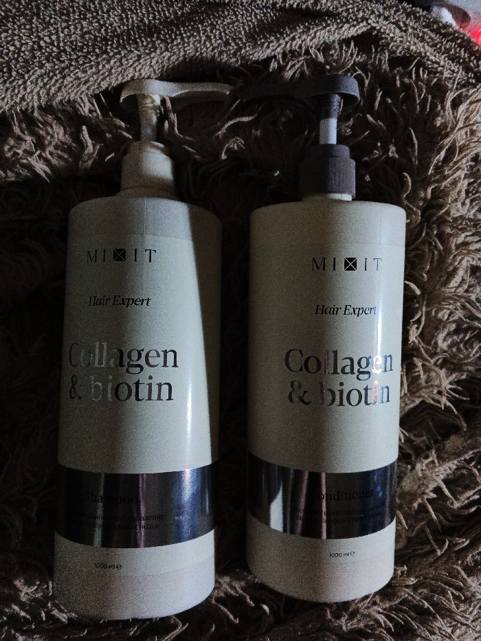 The scene depicts two large plastic bottles of hair care products resting on a dark, shaggy, textured surface, possibly a rug or towel, in Chaikovsky, Russia. Both bottles are light beige in color and feature pump dispensers. The bottle on the left has a light beige pump and is labeled "MIXIT Hair Expert Collagen & biotin Shampoo," with a stated volume of "1000 ml e." The bottle on the right has a dark gray pump and is labeled "MIXIT Hair Expert Collagen & biotin Conditioner," also with a volume of "1000 ml e." The background is dimly lit, with a faint reddish glow visible in the upper left corner, suggesting an artificial light source. No individuals or active interactions are present in the image.