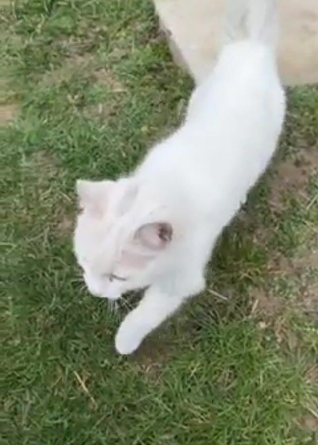 - "white cat approaching a person's hand, and then proceeding to walk onto a concrete slab near a building" by FM-PJSDy1, licensed under CC BY 4.0