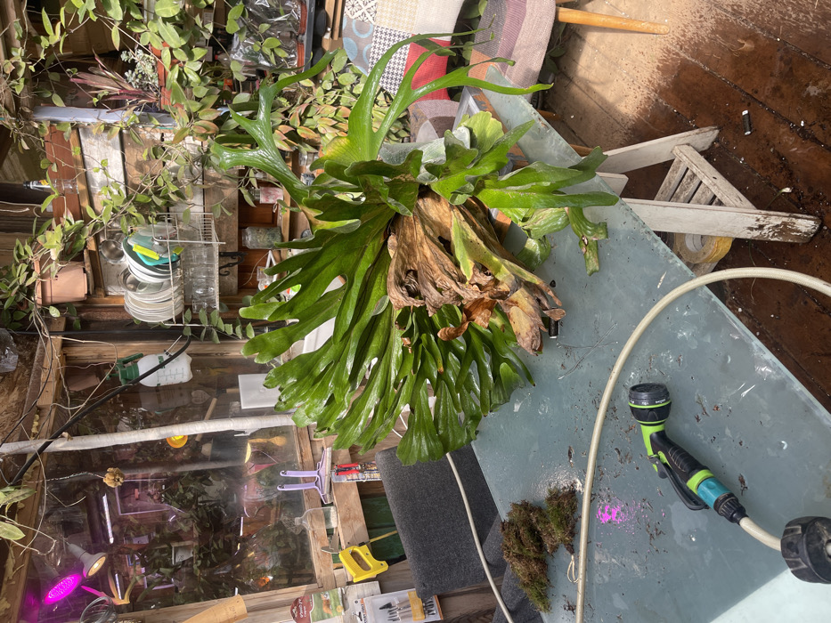 The scene depicts an interior space, likely a greenhouse or sunroom, located in the city of Pardes Hana-Karkur, Israel. A large staghorn fern (Platycerium species), mounted on a substantial piece of deadwood, occupies the center of a light-colored, possibly frosted glass or plastic-topped table in the foreground. The fern exhibits numerous healthy green fronds and some dried, brown fronds near its base. To the left of the fern on the table, two small clumps of dark green moss are present. A light-colored garden hose with a green and black spray nozzle is coiled on the table, extending from the lower left. The table surface shows marks and what appears to be scattered pink residue. In the mid-ground, a wooden chair with a colorful patchwork fabric cushion is partially visible to the right of the table. The room's structure consists of wooden beams and glass panes, through which other plants and reflections, including a pink-hued LED grow light, are visible. Various objects are arranged on shelves and hung on the wooden framework: a yellow hand saw, a purple squeegee, a white plastic spray bottle with measurement markings, and a metal dish drying rack holding plates and glasses. Numerous other potted plants, including climbing vines, populate the background, suggesting a densely planted environment. The floor beneath the table and chair is composed of wooden planks. No individuals are present in the image.