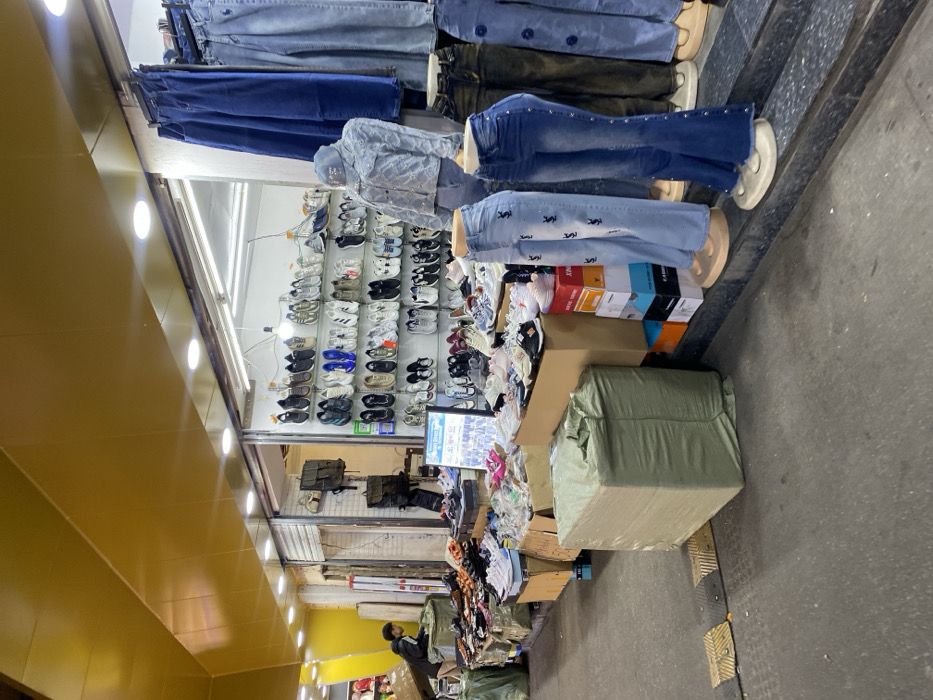 This image depicts a bustling commercial street scene in Yuexiu District, China. The foreground consists of a grey concrete pavement featuring two short sections of yellow tactile paving strips. A large, rectangular bale, wrapped in olive-green fabric, rests on the pavement. To the left, a lone male individual, wearing a dark jacket, is observed leaning over a makeshift display of various shoes and packaged goods, which are arranged on cardboard boxes and fabric bundles. The central area features a retail storefront, brightly illuminated, showcasing numerous pairs of athletic shoes and sneakers organized on multiple glass shelves behind a window. In front of this store, more shoes are openly displayed on various surfaces, including cardboard boxes and elevated platforms. A vertical sign with blue and white text is visible within this display area. Two dark backpacks are hanging from a fixture inside a darker, adjacent entryway to the left of the main shoe display. To the right, a section of the storefront is dedicated to apparel. Several mannequin legs and a torso are positioned on a set of steps, modeling various denim garments: a light-wash pair of flared jeans with dark embroidery, a dark-wash pair of flared jeans with silver studs along the outer seams, and another darker pair of jeans. A mannequin torso displays a light-wash denim jacket with a matching cap. Multiple pairs of various blue denim jeans are hanging from racks within the store entrance. The overhead environment features bright white fluorescent lighting and a prominent yellow, segmented ceiling or awning structure that extends across the scene.