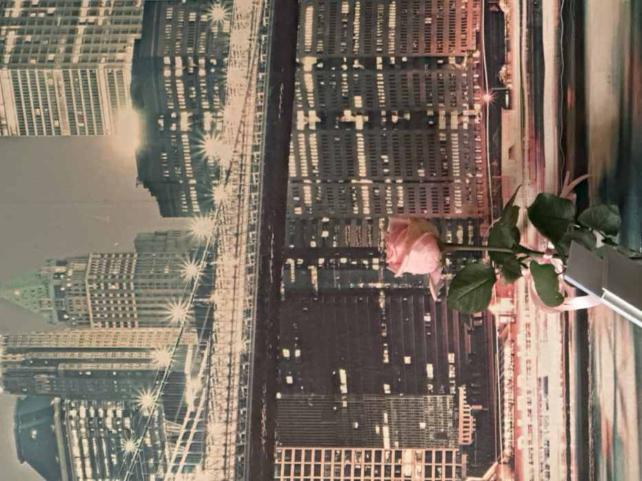 The image displays a single, light pink rose with multiple green leaves and a pink ribbon tied around its stem, positioned centrally in the foreground. The rose is supported by an opaque, light-colored object, possibly a vase or stand, visible at the bottom of the stem. The background consists of a large wall mural or wallpaper depicting a nighttime cityscape, identifiable as New York City. The mural features the Brooklyn Bridge with its distinctive suspension cables and prominent, star-like illuminations along its structure. Numerous tall skyscrapers with illuminated windows are visible behind and around the bridge, creating a vibrant urban night scene. The lighting in the photograph highlights the foreground rose against the illuminated background mural. The photograph was captured in Sofia, Bulgaria, with the background scene being a decorative mural rather than an actual view from the city. No individuals are present in the scene, and no specific actions or interactions are depicted beyond the static arrangement of the rose.