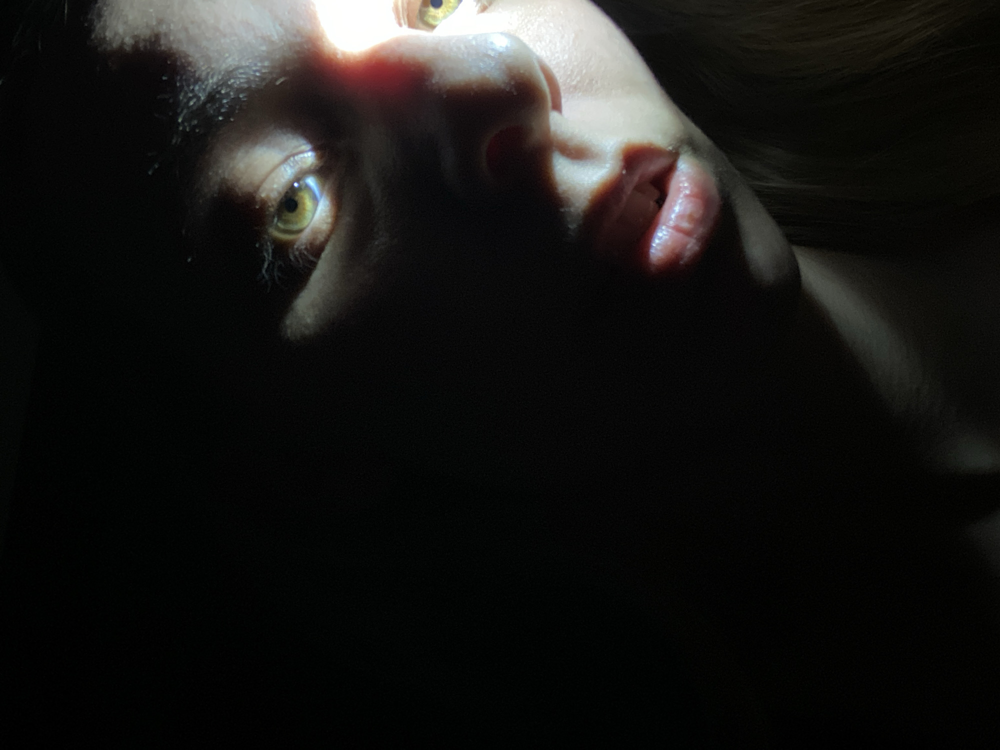 - "A close-up, low-angle shot shows a person's face in near-total darkness, illuminated by a bright light source positioned above their nose" by FM-M4Ogq1, licensed under CC BY 4.0