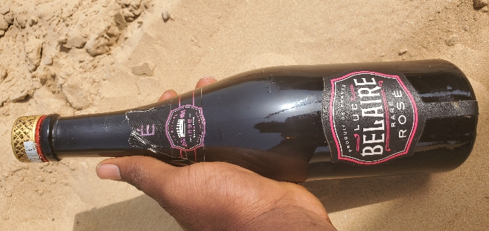 - "A dark-skinned human hand firmly grips a black glass bottle of "Luc Belaire Rare Rosé" against an uneven, sandy or light brown dirt background" by FM-JwA7r1, licensed under CC BY 4.0