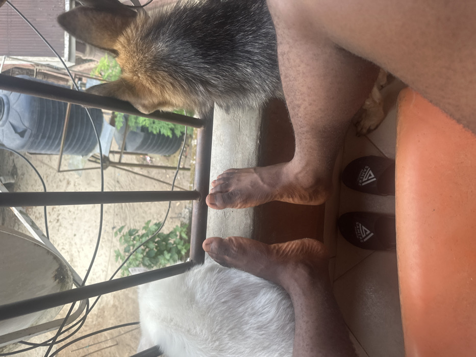 From an elevated perspective, a person's bare feet are visible on a balcony. Black slides are placed neatly beside their feet. A tan-colored German Shepherd dog peers over the railing with part of its head visible. A white dog is positioned below the human's feet. The balcony railing, storage tanks, and outdoor greenery are also visible in the background.