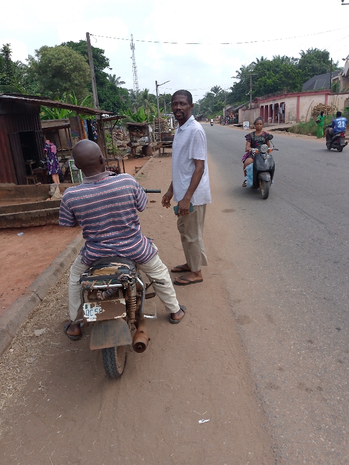 The image depicts a street scene in Alor, Nigeria, under an overcast sky. In the foreground, a bald man wearing a striped polo shirt and khaki pants is seated on a weathered, rusty motorcycle, facing away from the viewer. The motorcycle's rear fender and exhaust pipe are visible, along with a partially obscured license plate beginning "QC 58." To his right, a second man, wearing a light grey polo shirt and light brown pants, stands beside the motorcycle, holding a dark smartphone in his right hand. He faces towards the seated man. Both men are wearing flip-flops. The ground in the foreground consists of a reddish-brown dirt shoulder. Immediately to the left, several makeshift stalls constructed from corrugated metal and wood are visible, with one person in a patterned dress partially obscured within a stall. An asphalt road runs parallel to the dirt shoulder, extending into the background. In the midground, on the asphalt road, a young woman wearing a patterned top and light blue pants rides a dark grey scooter, with a passenger seated behind her. Further down the road, another individual on a blue motorcycle, wearing a jersey with the number "21" on the back, is also in motion. The background features additional buildings along the right side of the road, some with faded reddish walls and arched entryways. Dense green foliage and trees line both sides of the thoroughfare. Utility poles with overhead wires are present, and a tall, metal communication tower stands prominently in the far left background.