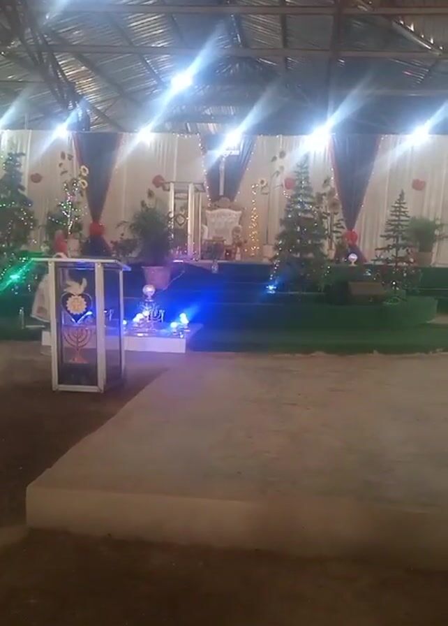 The camera records a church stage decorated for Christmas. The stage is covered in green artificial turf. Two Christmas trees flank the stairs leading up to the stage. There is also white fabric and red and black curtains behind the stage. A cross is prominently displayed on the stage. At the foot of the stage is a lectern decorated with a menorah. The lights in the church are bright and create a hazy, diffused effect. A person in a white garment walks in the background to the left of the stage.