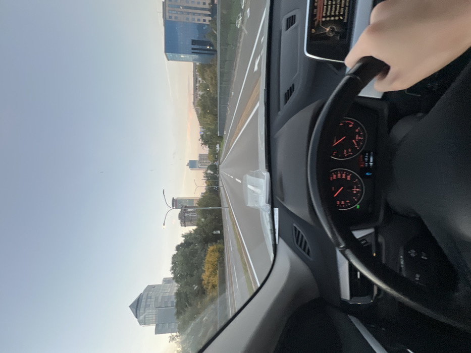 The image depicts a first-person perspective from the driver's seat of a vehicle moving along a multi-lane city road at what appears to be dusk or dawn, given the soft blue and light orange hues in the sky. **Location:** The scene is located in the city of Brescia, Italy. Specifically, the prominent building visible on the left side of the road, characterized by its multi-faceted, reflective glass facade and distinctive pyramidal roof, is identifiable as the "Crystal Palace" (Palazzo di Cristallo) in the Brescia 2 business district. Other modern office buildings are visible in the background on both sides of the road. **Scene Details:** * **Vehicle Interior:** The foreground shows the black dashboard and a black multi-function steering wheel. A person's right hand with a light skin tone is visible on the right side of the steering wheel. A dark-clad leg is partially visible below the steering wheel. The instrument cluster, featuring two circular analog gauges with red needles and backlighting, is visible; both needles are in a low position, indicating low speed and engine RPM. A digital display is centered between the gauges. To the right, an infotainment screen displays a menu listing "iPhone" multiple times, suggesting connected devices, with "Dispositivi" (Italian for devices) visible. A small, rectangular white object, possibly folded paper or a receipt, rests on the dashboard near the windshield. * **Exterior Environment:** The vehicle is on an asphalt road with clearly marked white lanes. A concrete barrier or median separates traffic lanes. Green trees and bushes line the sides of the road, with some foliage displaying autumnal yellow tones on the left. Modern streetlights with curved arms are spaced along the road. In the distance, the road appears clear with minimal visible traffic. The sky is largely clear, transitioning from light blue overhead to a pale orange near the horizon.