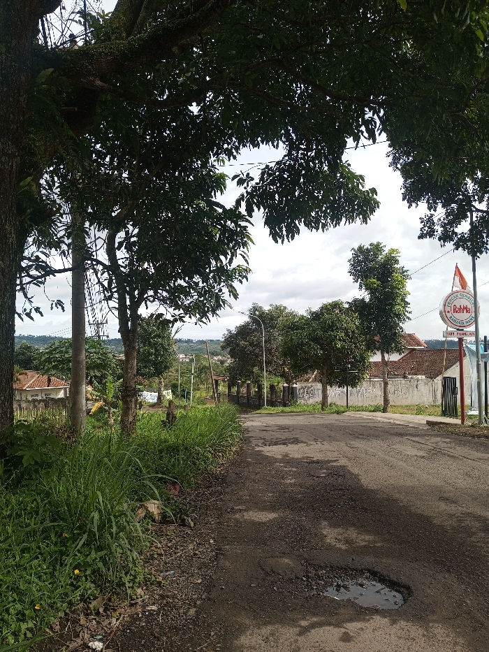 A rural road under a canopy of trees has a large puddle in a pothole. Lush green vegetation borders the road's left edge. Houses with red-tiled roofs and white walls sit along the road, with a sign reading "Rahma" visible on the right. Distant hills are visible in the background, under a partly cloudy sky.