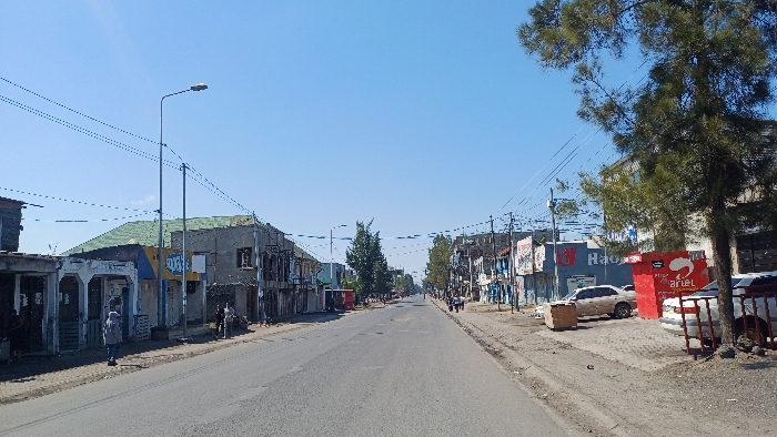 The image displays a daytime street scene in Gisenyi, Rwanda, under a clear blue sky. The perspective is from street level, looking down a paved, two-lane road that recedes into the distance. On the left side of the road, an unpaved shoulder borders a continuous line of commercial buildings. These structures, primarily one to two stories high, show varying conditions, some appearing weathered. Visible signage includes a yellow and blue "SPAR" logo on one building. Utility poles with multiple overhead wires run along this side. One individual, wearing a light-colored hooded top, stands on the shoulder in the foreground, facing away from the camera. Other pedestrians are visible further down the street. On the right side of the road, an unpaved, dusty shoulder extends alongside a row of similar commercial buildings. A large, leafy tree stands prominently in the mid-foreground, partially obscuring some structures. Adjacent to this tree, a distinct red advertising structure with "Airtel" branding is visible. Another sign displaying "Hao" is present on a building further down. A light-colored sedan and a white vehicle are parked on the shoulder. Several pedestrians are walking along this side of the street. Utility poles and overhead wires are also present. The asphalt road surface appears worn, with visible patches. There is no vehicular traffic in the immediate foreground, but the street extends to the horizon, flanked by buildings and light pedestrian activity.