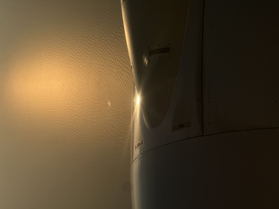 The image presents an aerial view captured from an aircraft, looking down over a large body of water in the vicinity of Unknown, Israel. The lower third of the frame shows a portion of a metallic aircraft engine nacelle and an adjacent wing section, characterized by visible riveted panels and access latches. A bright, golden-orange reflection, consistent with direct sunlight, illuminates a curved surface of the aircraft part in the bottom right. The upper two-thirds of the image depicts the water's surface, which exhibits distinct ripple patterns and is intensely bathed in a widespread golden-orange light from a sun reflection. The atmospheric conditions appear hazy or misty over the water. No individuals or active interactions are visible within the scene.