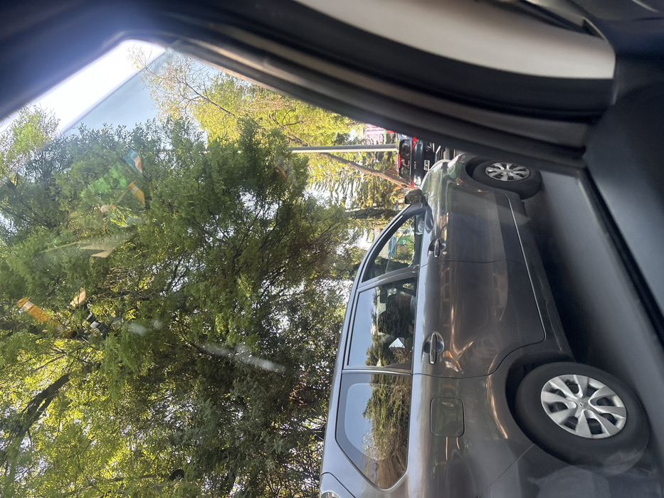 The image depicts a daytime street scene in Mexico City, Mexico, observed from the interior of a vehicle looking out the passenger side window. The window's frame and a portion of the vehicle's dark interior are visible on the right, with lens flares and reflections across the glass. In the mid-ground, a dark grey Toyota Avanza compact MPV is positioned parallel to the viewer's vehicle, either stationary or moving slowly in traffic. The outline of a person's head is partially visible in the front passenger seat of the Avanza. Behind the Avanza, a dark-colored SUV, possibly a Kia, is also in traffic. Its license plate is partially visible, displaying "JAB." The background is dominated by dense, green leafy trees forming a substantial canopy overhead, with sunlight filtering through the foliage. A utility pole is visible among the trees, and further back, additional evergreen trees are present. The sky is clear. The overall environment suggests an urban or suburban street lined with mature trees. The vehicles are in a queue, indicating either a traffic jam or a stop at an intersection.